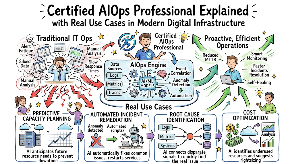 The Certified AIOps Professional is a global benchmark for engineers who aim to apply artificial intelligence to IT operations. It represents a shift from traditional, human-led monitoring to autonomous, self-healing systems. The certification exists to validate an engineer’s ability to handle massive telemetry data and use algorithmic models to predict and resolve incidents. It focuses on real-world production environments where data quality and model accuracy directly impact business uptime. By moving beyond theoretical machine learning, it aligns with modern engineering workflows that require speed and reliability.