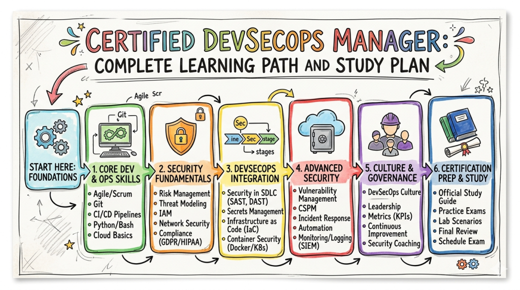 Software teams now ship code faster than ever, across cloud, containers, and microservices. If security is not built into this speed, one small gap can cause incidents, data leaks, and compliance problems. The Certified DevSecOps Manager program from DevSecOpsSchool.com is designed for professionals who want to lead security across DevOps, cloud, and product teams in a structured and practical way. It goes beyond tools and scripts and focuses on strategy, governance, risk management, and culture. This guide explains what the Certified DevSecOps Manager is, who should take it, what skills you gain, how to prepare, which paths you can follow (DevOps, DevSecOps, SRE, AIOps/MLOps, DataOps, FinOps), and how it fits into a long-term certification roadmap for software engineers and managers.